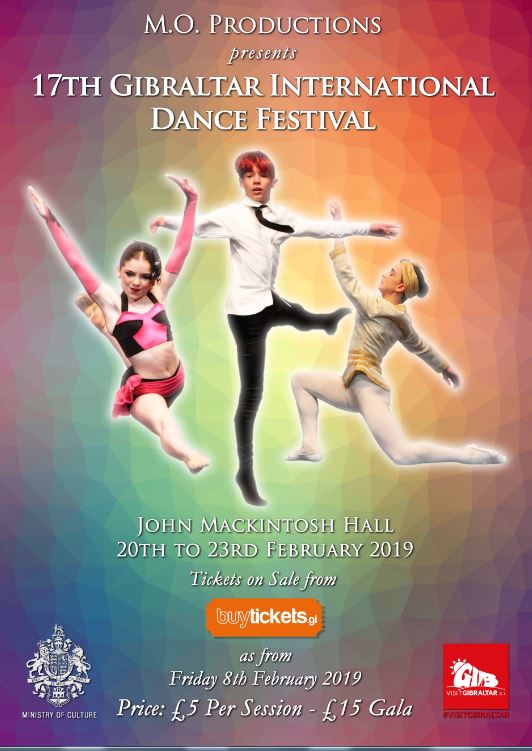 The 17th Gibraltar International dance Festival is a dance competition in various dance genres and age divisions. It features dancers from various countries with monetary prizes amounting to £2,000. Local dancers use this platform to then represent Gibraltar at other international festivals and competitions including the International Dance Organizations World Championships.