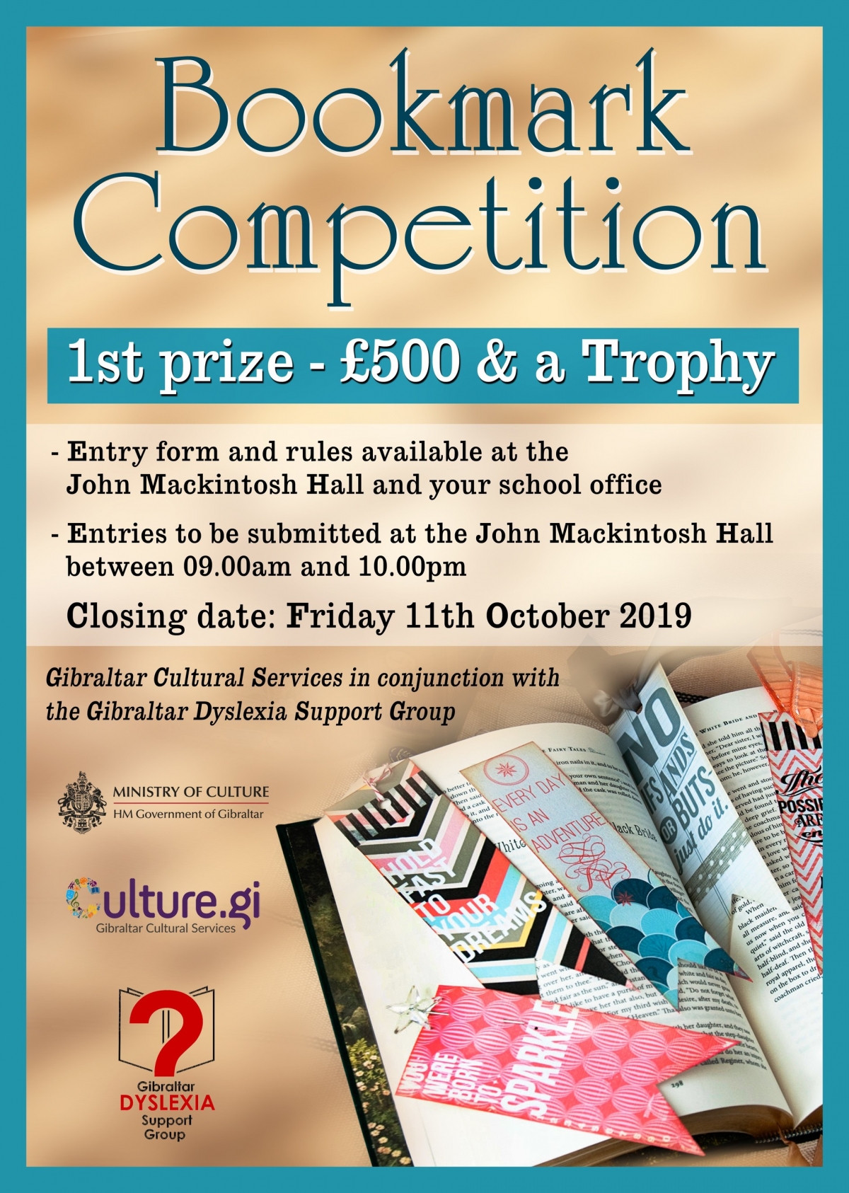 Gibraltar Cultural Services, on behalf of the Ministry of Culture and in conjunction with The Gibraltar Dyslexia Support Group, will hold a Bookmark Competition as part of the 2019 autumn cultural programme.
