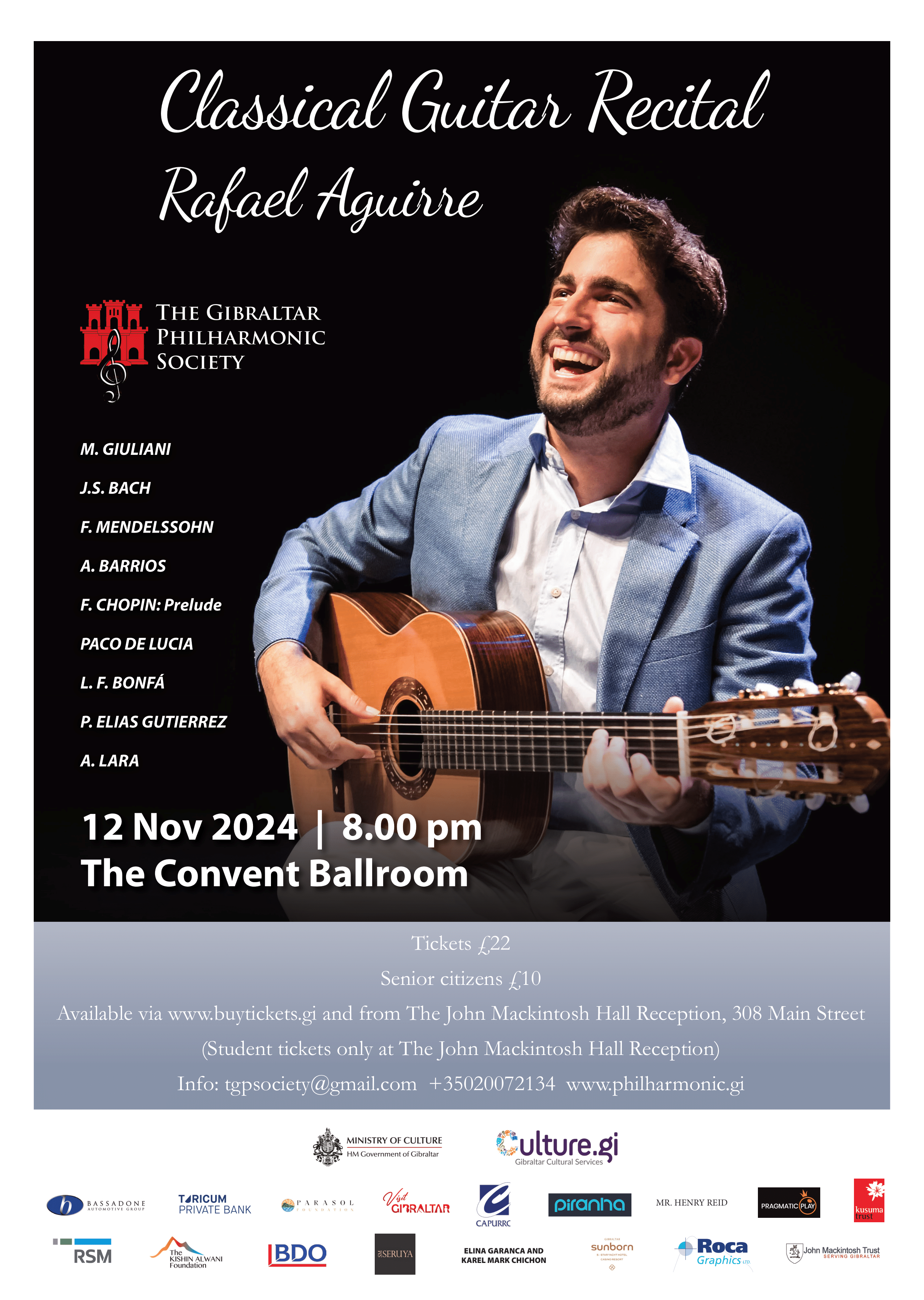 We are delighted to announce that we are back in action and that our forthcoming concert will feature one of the most sought-after classical guitarists at international level, Rafael Aguirre! The concert is on 12 November 2024 at 8 pm at The Convent Ballroom.