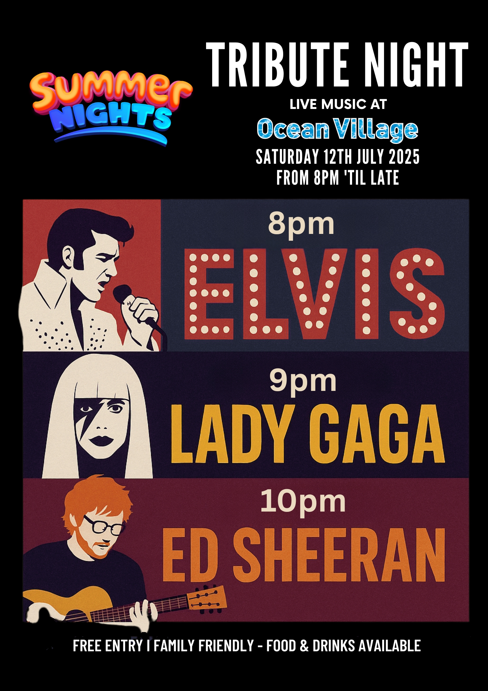 Three icons. One stage. Join us for a night of live tribute performances celebrating the music of Elvis, Lady Gaga, and Ed Sheeran. Good music, great atmosphere, and a waterfront view. Free Entry | Food & Drink Available