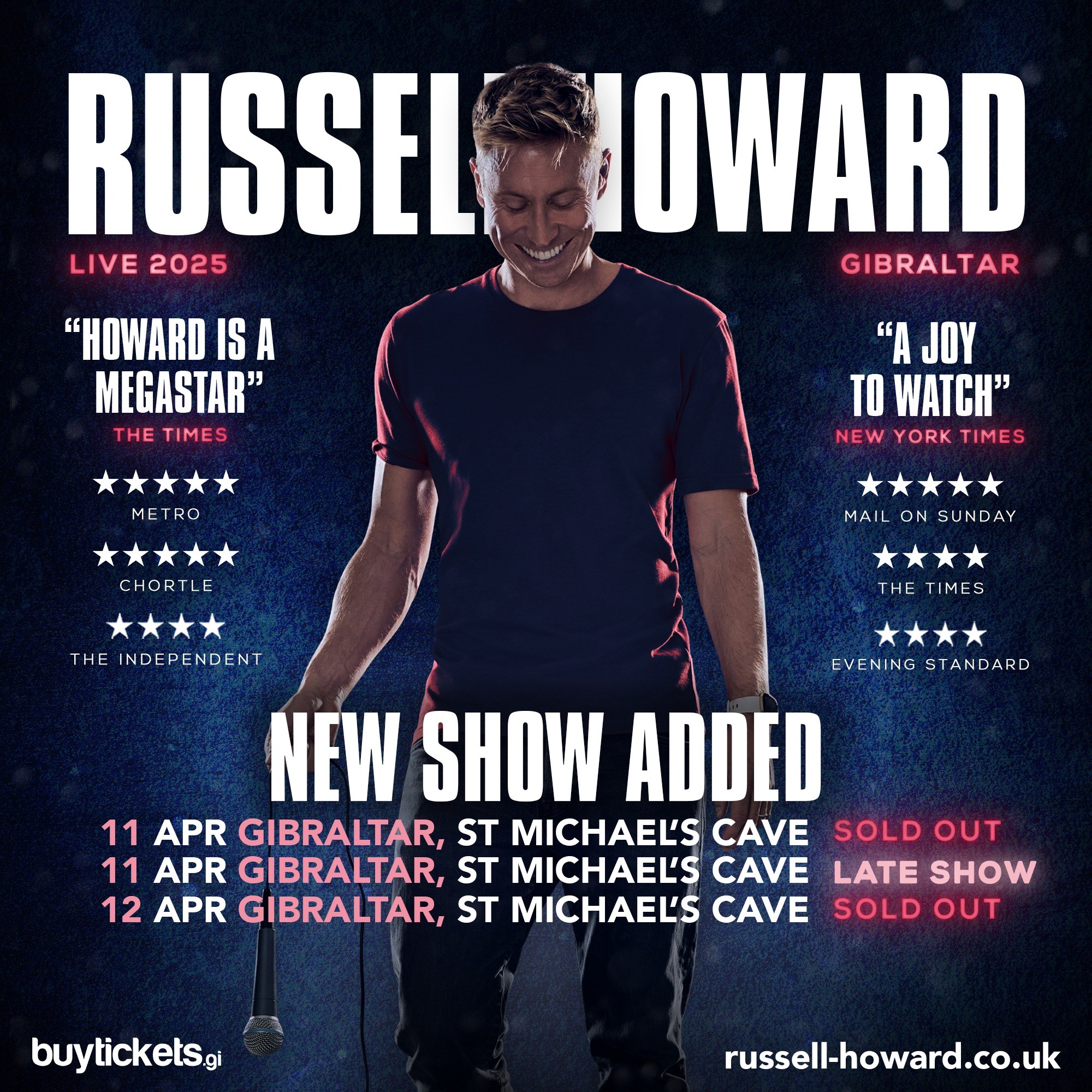 Join “one of the world’s top comedians” (Sunday Times) as he lands for the first time in Gibraltar with his signature wit and charm! As we reel from one global crisis to the next, join Russell, ‘the uplifting Comedy King’, as he puts the world to rights in his own uniquely hilarious way. Following his record-breaking Respite tour across 24 countries, Russell capped it off with his Netflix special Lubricant. Don’t miss his latest insights from The Russell Howard Hour, where he’s interviewed icons like Greta Thunberg and Jim Carrey. With over a billion views online, Russell’s comedy is not to be missed!