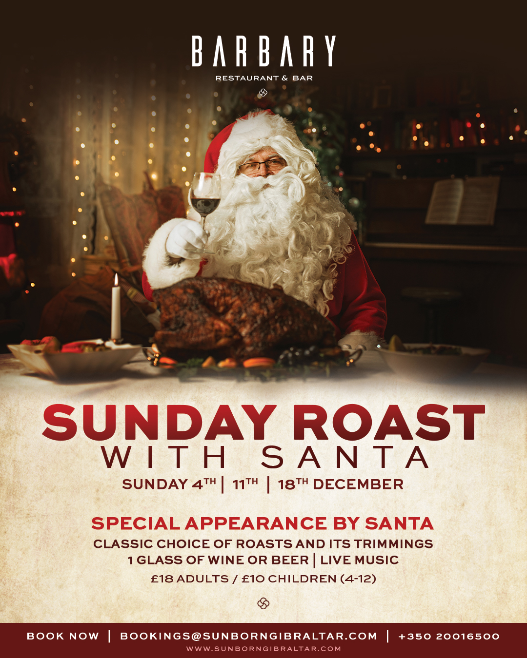 Our Roasts can be enjoyed on Sunday 4th, 11th and 18th of December and it cost £18 for adults and £10 for children! Book your table today via email bookings@sunborngibraltar.com or via phone +350 20016500.