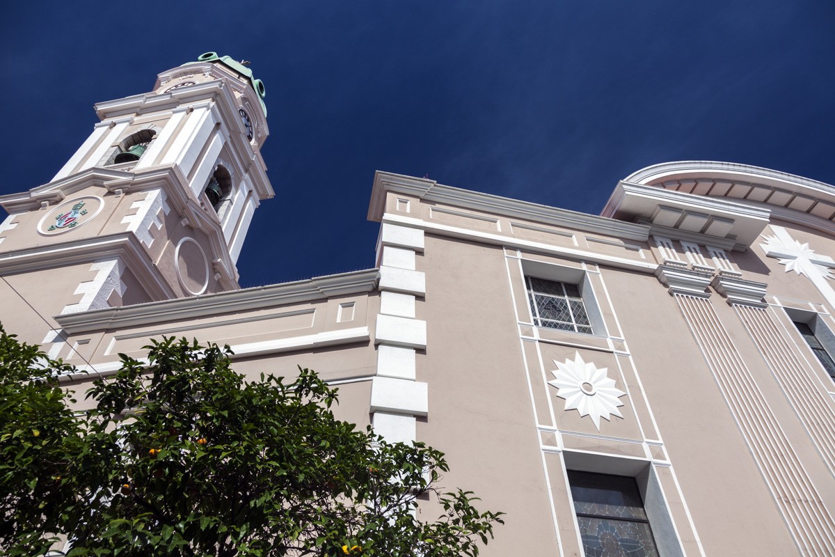 Situated in the courtyard is the Shrine of Our Lady of Lourdes, her statue having been placed there in gratitude in 1858 by Bishop Canilla, whose brother had been miraculously cured of a tumor during a visit to Lourdes. The grateful Bishop also placed a large statue of Our Lady at the top of the tower for all to see, but this was removed at the turn of the century. Inside the Cathedral the High Altar is very grandiose and is in the style of that of St. Peter’s in Rome. The beautiful marble plinth and columns with the six-ton bogatino top were originally bound for South America when the ship carrying this precious cargo sunk in the harbour. The Arengo family bought the salvage rights and installed the marble in the Cathedral as their family altar, it was later placed in its present position. The silver was brought back from the New World 500 years ago.