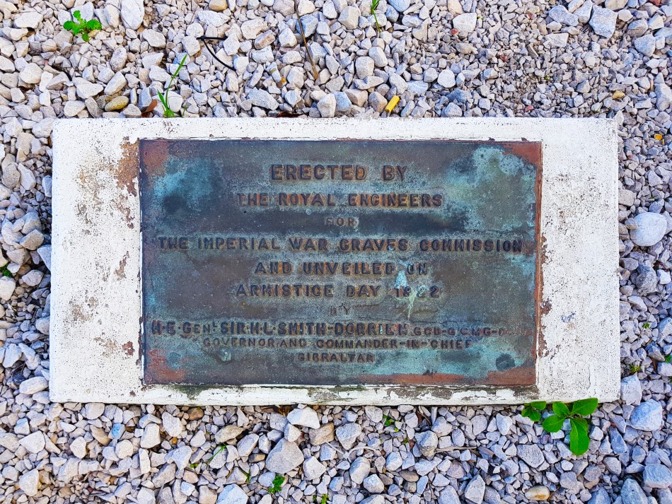 The Gibraltar Cross of Sacrifice is a war memorial designed by Sir Reginald Blomfield in 1917, and his monument is found in numerous Commonwealth War Graves Commission cemeteries. The cross in Gibraltar was erected by the Royal Engineers for the commission, and unveiled on Armistice Day 1922. The inscription reads: