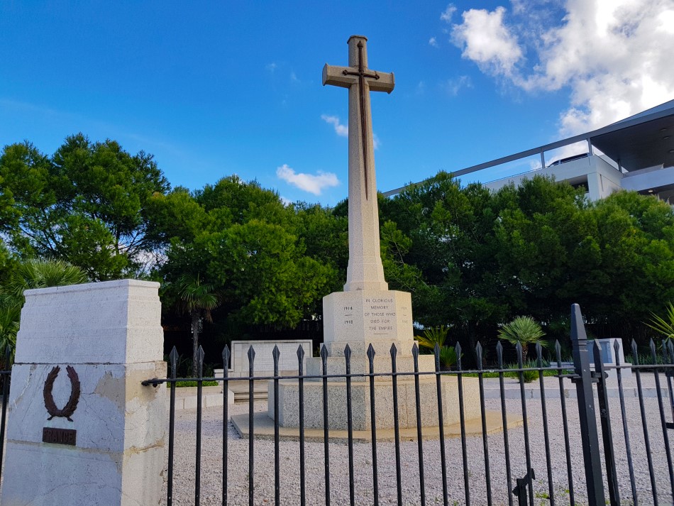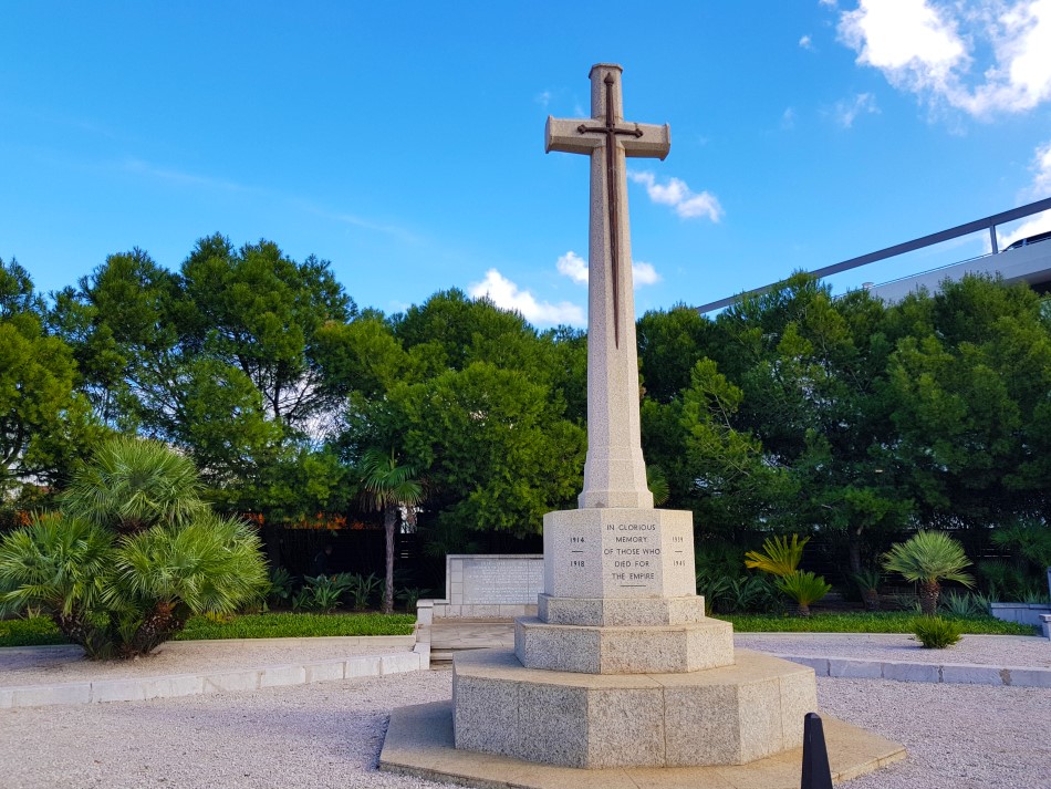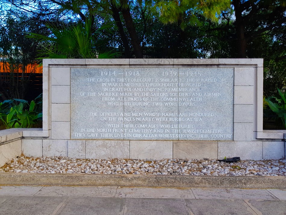 The cross in this forecourt is similar to those raised throughout the world in grateful and undying remembrance of the sacrifice made by the sailors, soldiers and airmen from all parts of Commonwealth who died during the two World Wars. The officers and men whose names are honoured on the panels nearby were buried at sea. With their comrades who lie buried in the North Front cemetery and in the Jewish cemetery they gave their lives in Gibraltar whilst serving the Country.