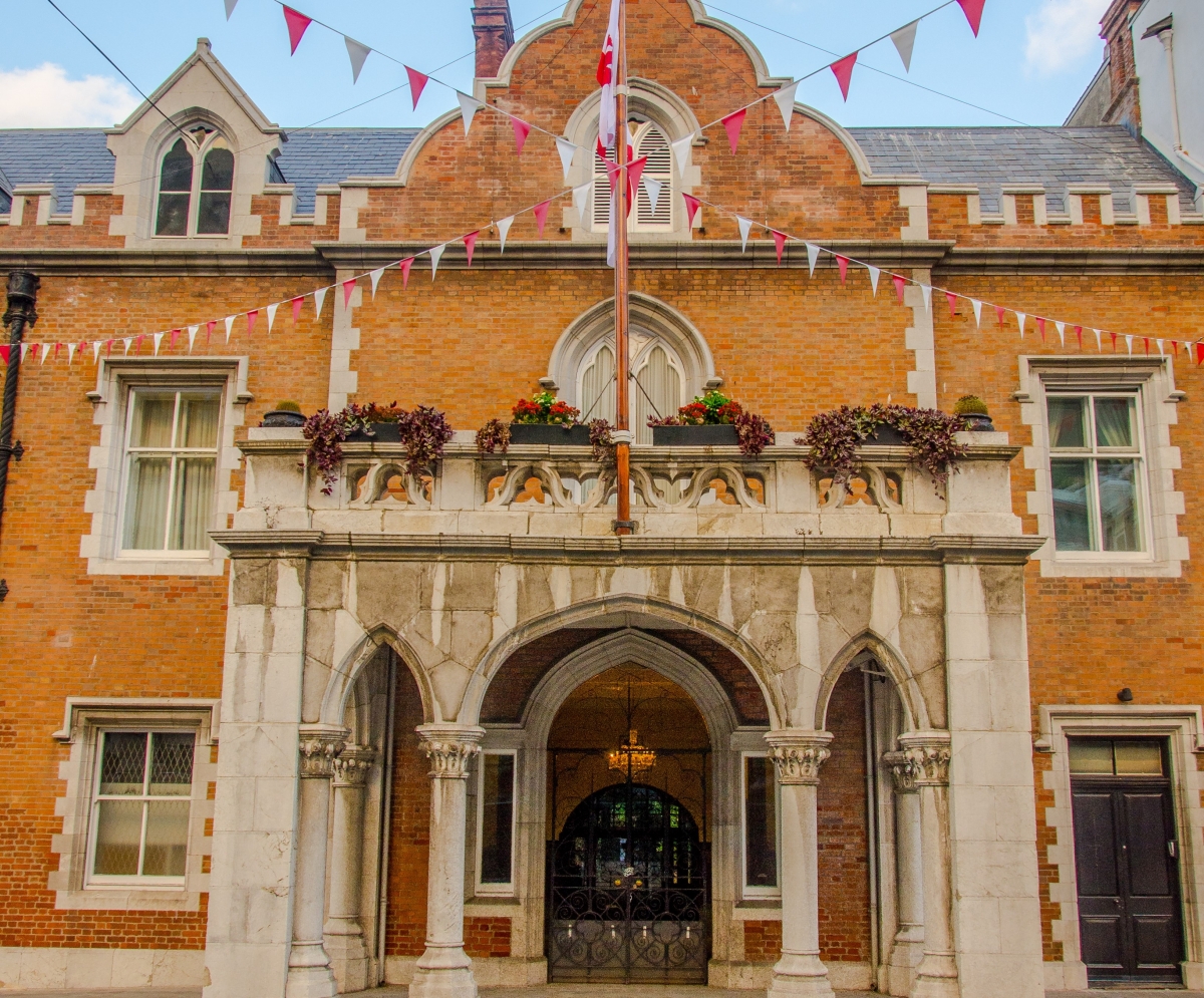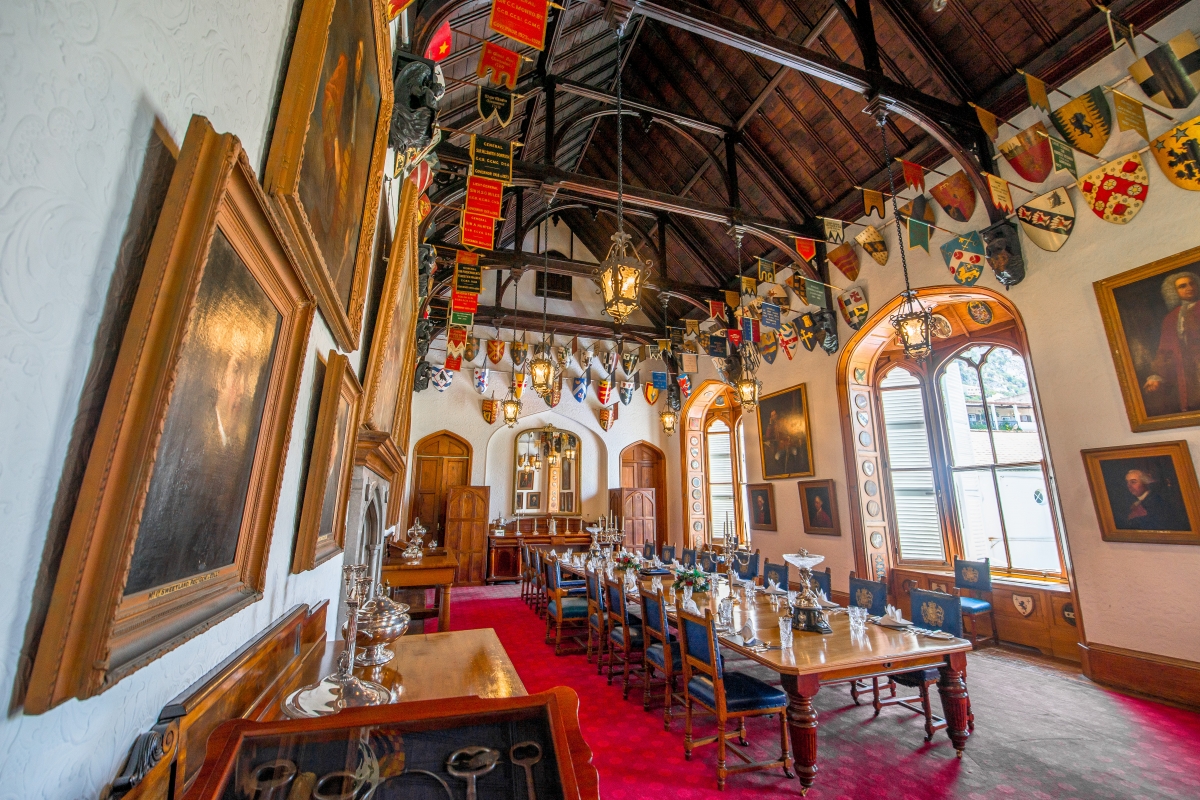 Banqueting Hall: Part of the ancient Convent of 1531. This area was probably the living quarters of the monks during the 16th and 17th century. Between 1863/64 General Codrington, the then Governor, undertook a major enhancement of the Convent and this room is perhaps what has survived best. Three beautiful stained glass windows were lost in 1951, but in the window alcoves we still have the list of Moorish Caliphs and Governors of Gibraltar from 711 to 1462AD. The Spanish Monarchs and Governors dating from 1462 to 1704 adorn the arches of these alcoves. Around the walls hang pennants and shields with the Coat of Arms of all Governors (and Lt Governors) from 1704 to date. All but two are British Officers. The Royal Coat of Arms of Queen Anne (1702/1714) commences those of all our monarchs to the present.